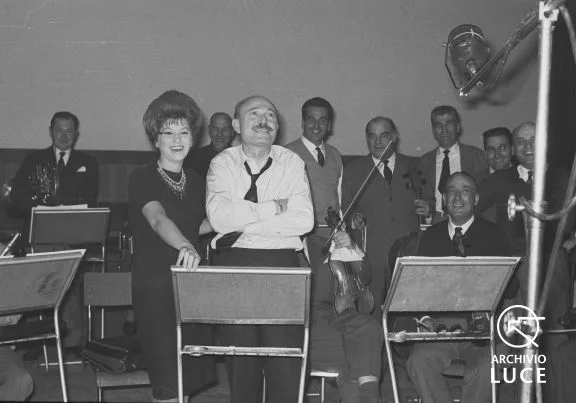 Armando Trovajoli, cento anni di musicaIl 2 settembre del 1917 nasceva il maestro Armando Trovajoli Timeline Non sono tantissimi i cinegiornali presenti in Archivio che vedono protagonista il Armando Trovajoli; appena di più le foto. Prevale sempre l’aspetto mondano e infatti la maggor parte dei servizi sono legati alle sue nozze con Anna Maria Pietrangeli.Per ricordarlo ci affidiamo alle sue parole: “Non ho nessun rimpianto. Mi basta e mi avanza quello che la provvidenza mi ha dato … Sono stato fortunato di vivere in un ambiente così bello. Sono felice di essere musicista. Papà voleva che io facessi l’architetto. Aveva sbagliato. Lui non a caso mi ha messo un violino… un quartino così piccolo … Non avrei mai immaginato di fare anche il compositore. Sono felice, perché meglio di essere musicista non c’è niente“. Miranda Martino ed il maestro Armando Trovajoli in piedi dietro ad un leggio nello studio di registrazione della Fono Lux, 1961 Armando Trovajoli e Miranda Martino ad una prova per il Festival di Sanremo, 1961 Armando Trovajoli e Miranda Martino ad una prova per il Festival di Sanremo, 1961 Anna Maria Piarangeli e Armando Trovajoli al cocktail per il film I moschettieri del mare, 1961 Anna Maria Pierangeli seduta a tavola con Armando Trovajoli durante il cocktail per il film I moschettieri del mare, 1961 Anna Maria Pierangeli, seduta a un tavolino, stringe la mano a Yoko Tani durante il cocktail per il film I moschettieri del mare. Armando Trovajoli in piedi tra le due donne, 1961 Anna Maria Piarangeli e Armando Trovajoli al cocktail per il film I moschettieri del mare, 1961 Armando Trovajoli ripreso mentre bacia Anna Maria Pierangeli sulla scaletta dell'aereo che li ha portati a Roma, 1962 Anna Maria Pierangeli e Armando Trovajoli seduti su una poltrona mentre vengono ripresi dai fotografi, 1962 Anna Maria Pierangeli e Armando Trovajoli seduti ad un tavolo del ristorante Palazzi in occasione di un cocktail in loro onore, 1962 Armando Trovajoli e Anna Maria Pierangeli posano all'interno del ristorante Palazzi in occasione di un cocktail in loro onore, 1962 Armando Trovajoli in un cinema, [1962] “Non è facile omaggiare la lunghissima carriera di un artista che può vantare oltre 300 colonne sonore di film e la partitura di opere teatrali divenute dei classici come Rugantino e Aggiungi un posto a tavola“.Così si legge nella presentazione su cinecitta.com del cofanetto che raccoglie il DVD di Mario Canale e Annarosa Morri dedicato al maestro, dal titolo Armando Trovajoli – Cent’anni di musica che Istituto Luce Cinecittà ha prodotto e che proprio in questi giorni è stato inserito nella cinquina dei nastri d’argento nella sezione Cinema e spettacolo.Vai alla timelineDall'archivioPresentazione della rivista Giove in doppio petto di Garinei e Giovannini, 1954Viaggi di nozze, 1962Al locale romano Brigadoon consegnati premi a protagonisti del mondo delle spettacolo, 1962Armando Trivajoli nell’Archivio fotografico